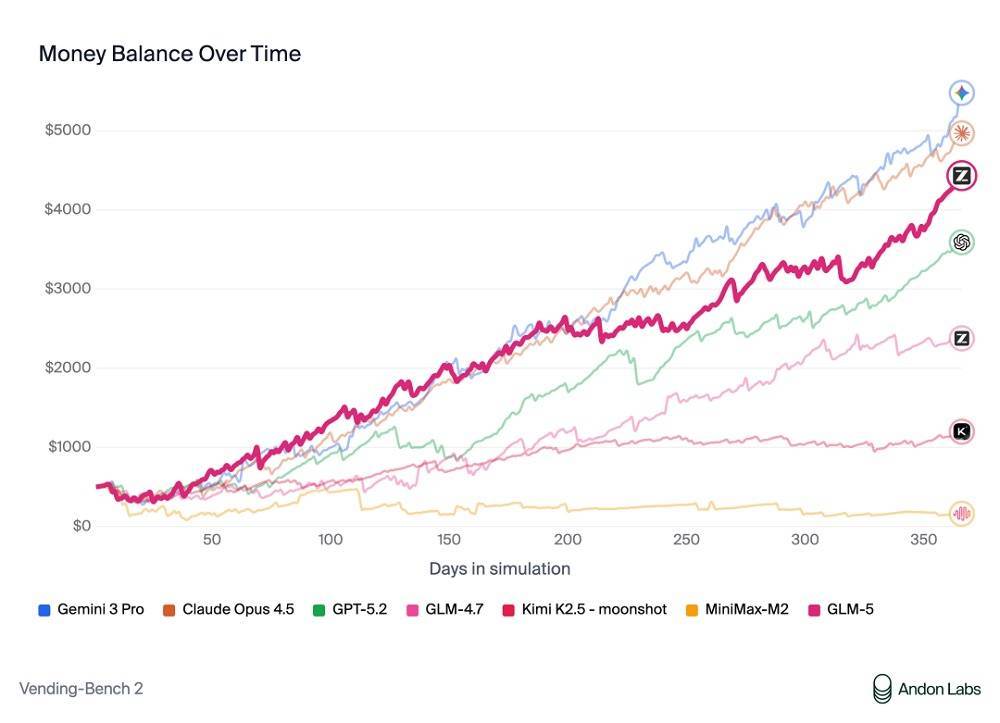 在衡量模型经营能力的Vending Bench 2中,GLM-5也获得开源SOTA。Vending Bench 2要求模型在一年期内经营一个模拟的自动售货机业务,GLM-5最终账户余额达到4432美元,经营表现接近Claude Opus 4.5,展现了不错的长期规划和资源管理能力。